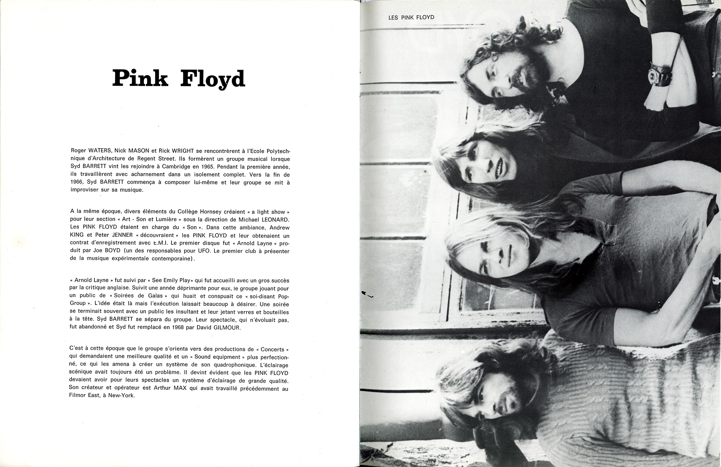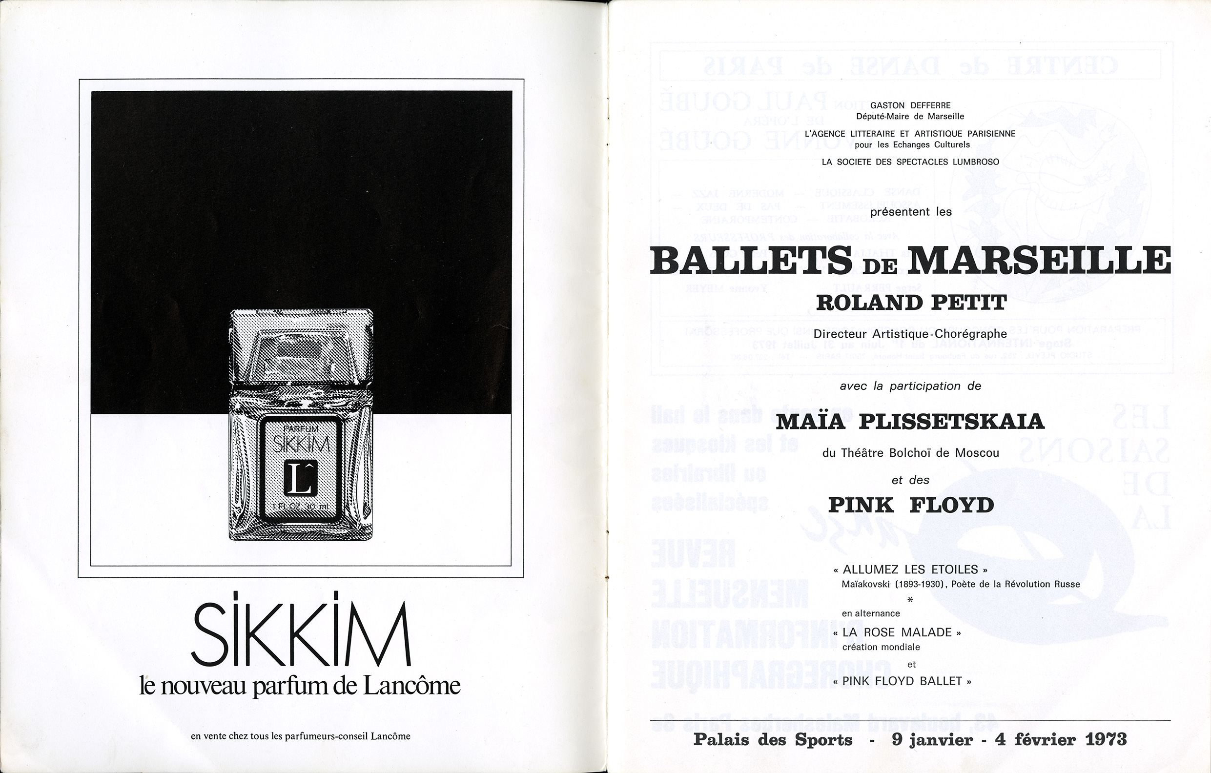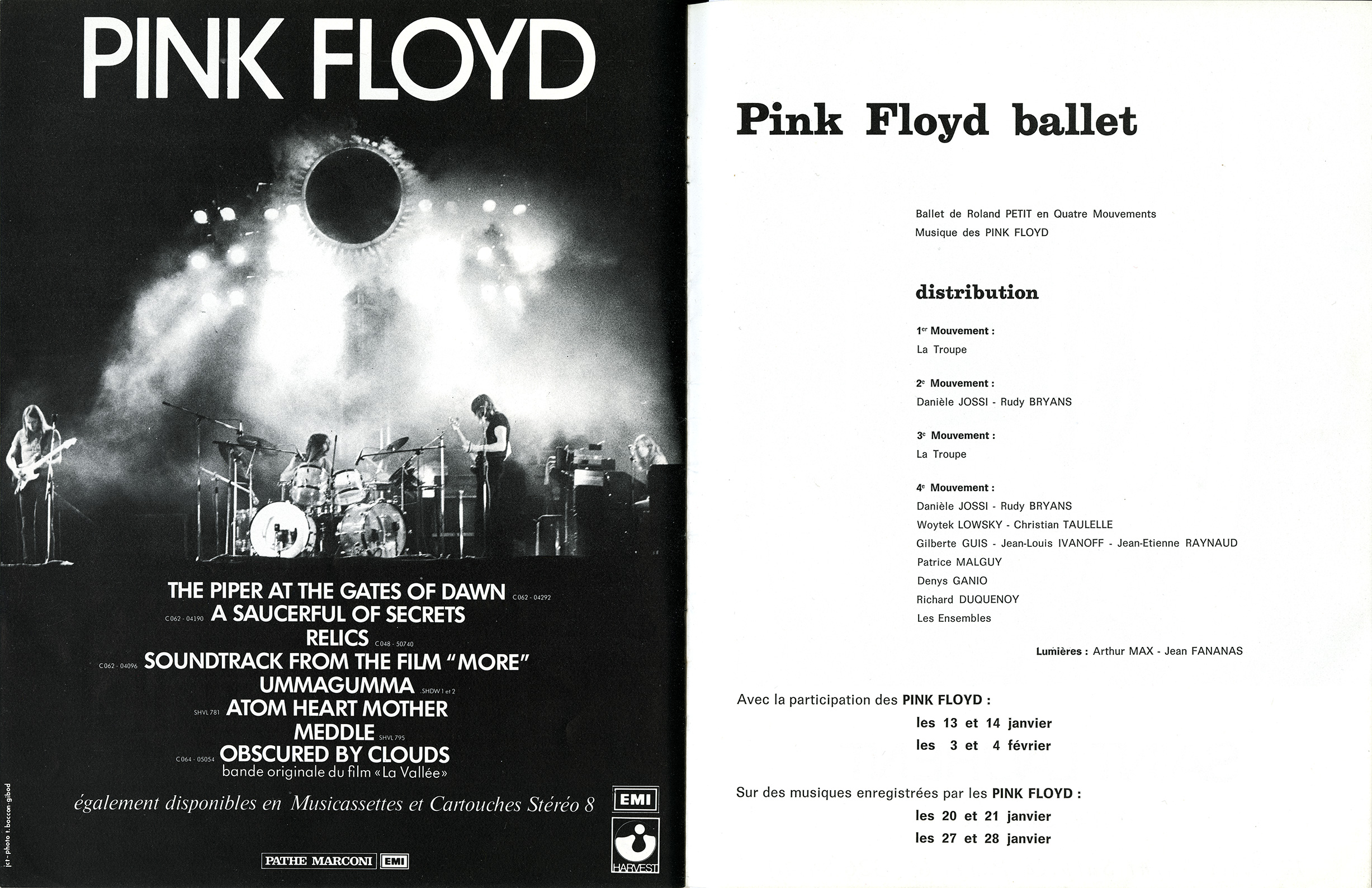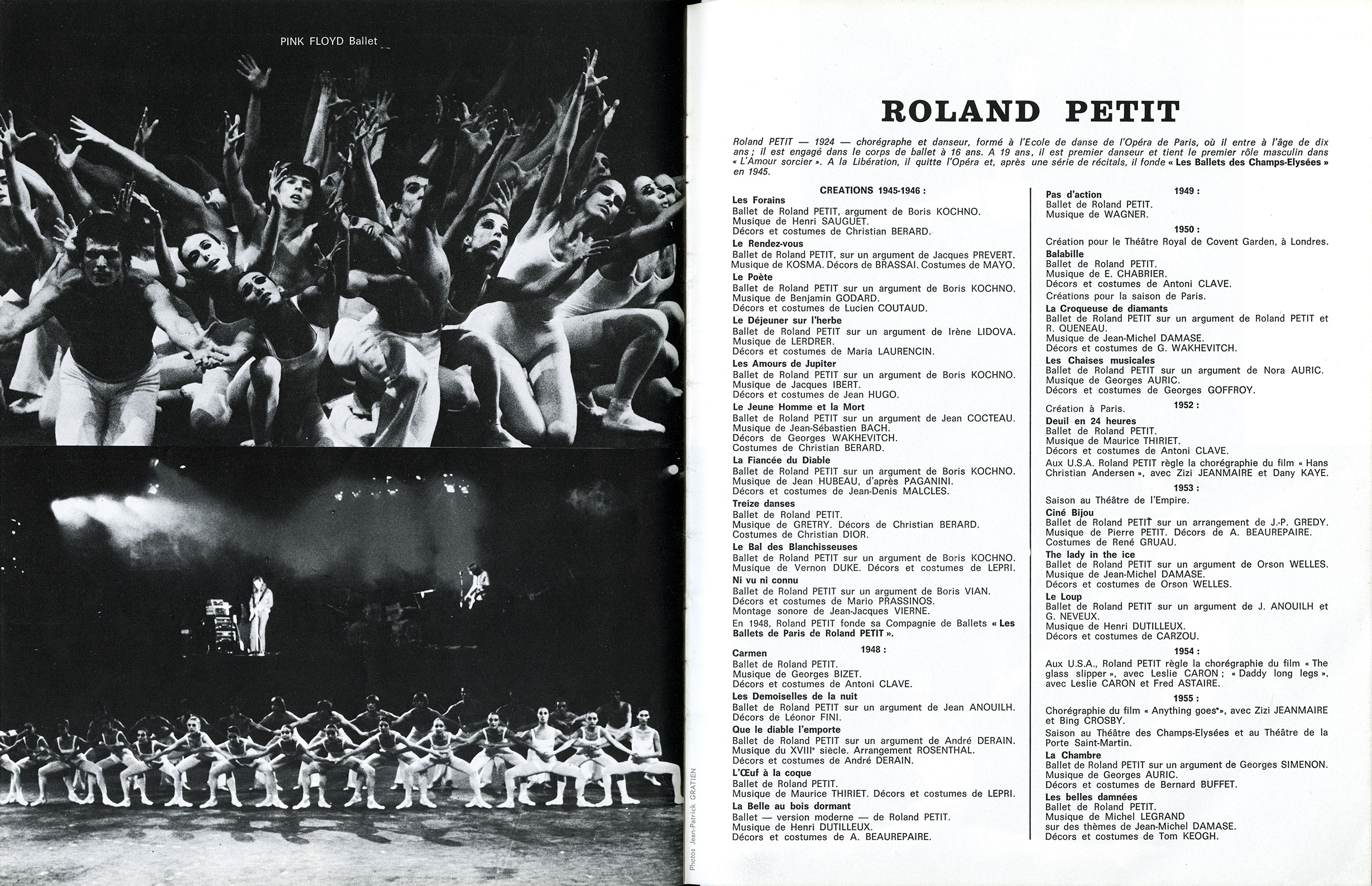 Folder Info: Includes extensive information in French about the Roland Petit ballet, dancers, and director Roland Petit. Features four pages about Pink Floyd, with a brief history of the band, a full page photo of the band members, an ad for Pink Floyd albums, and a page about the Pink Floyd ballet.