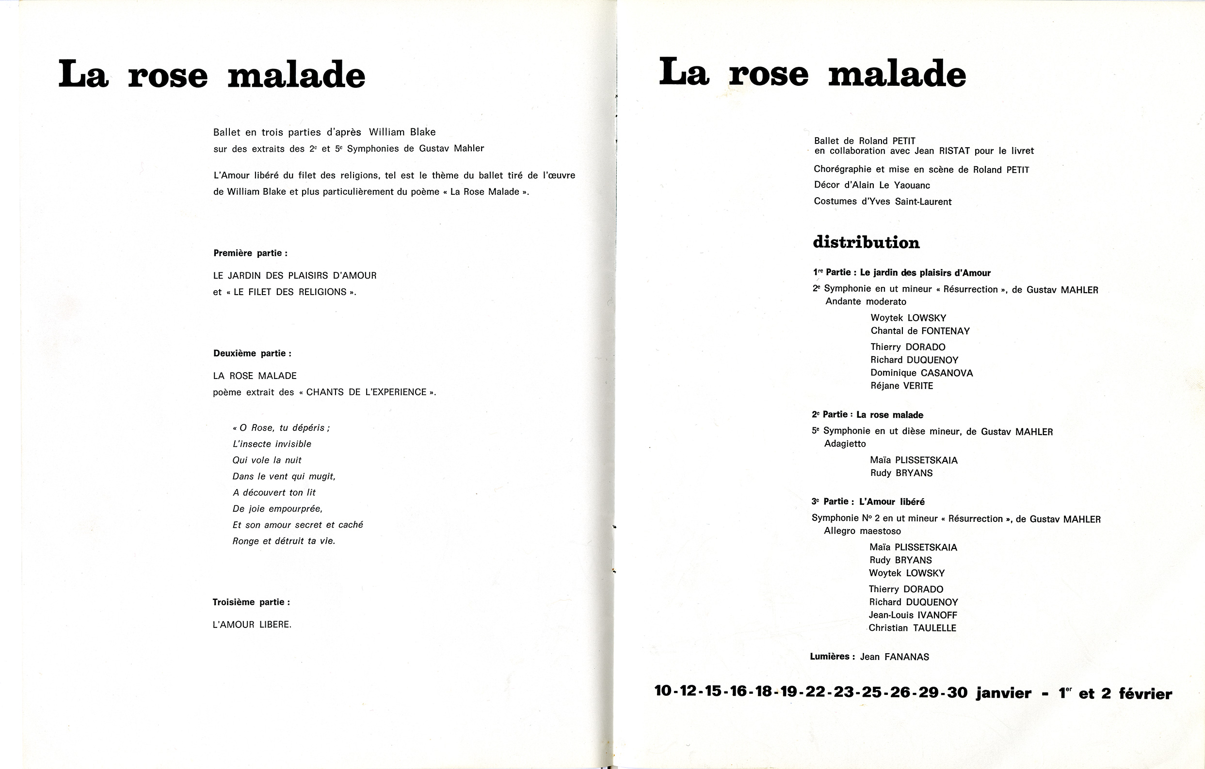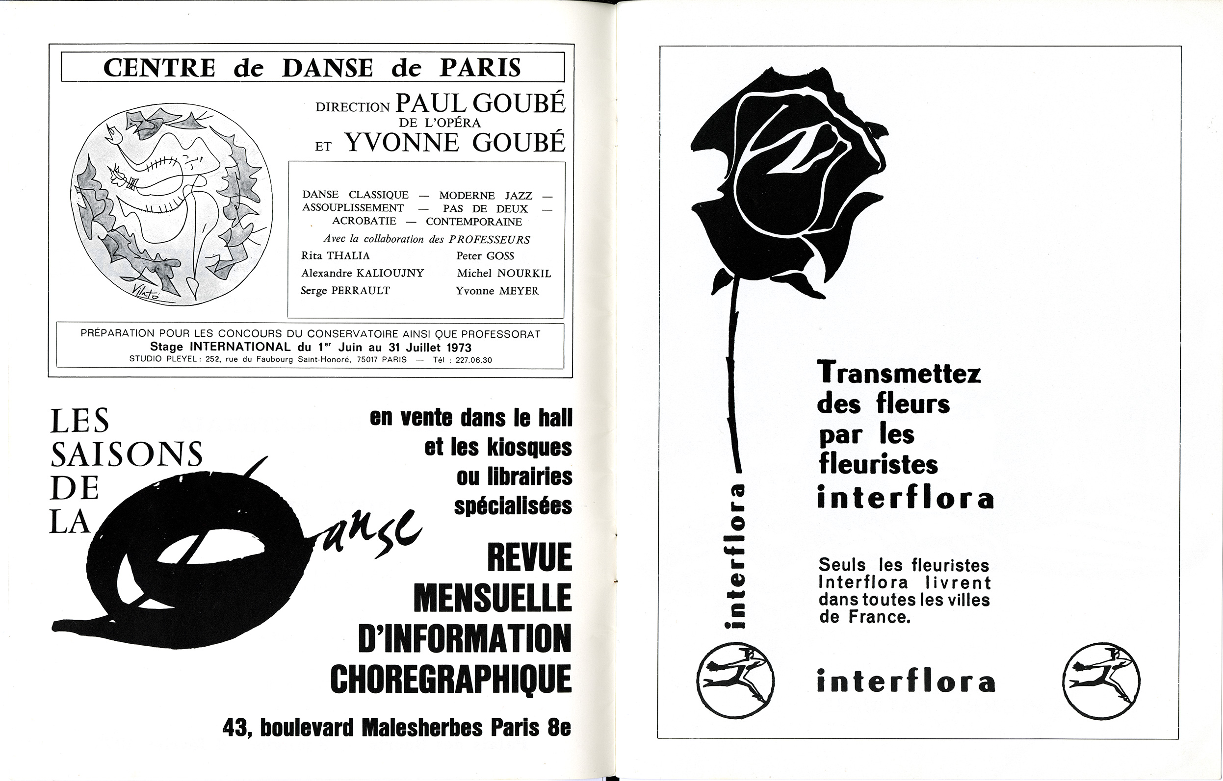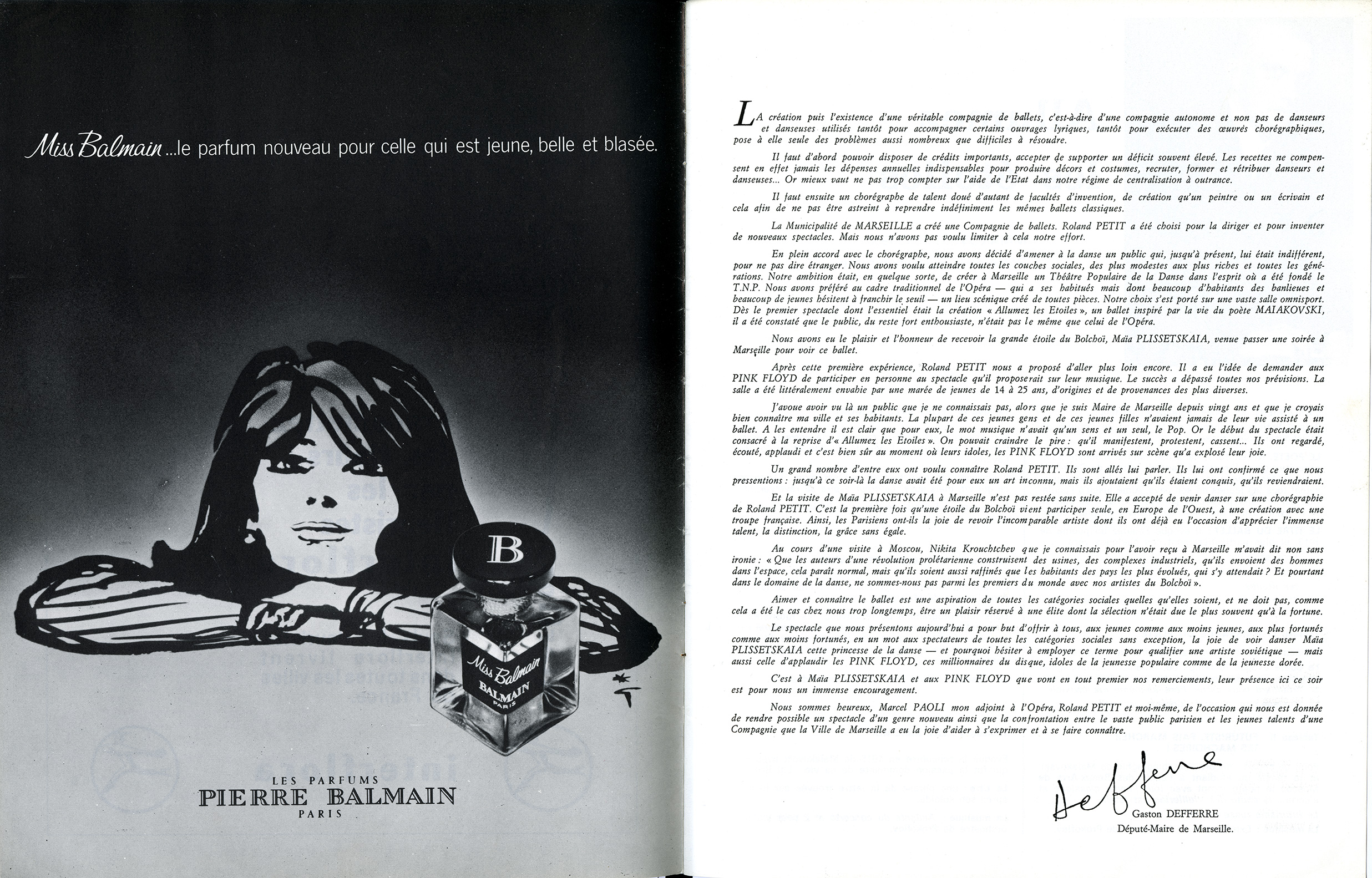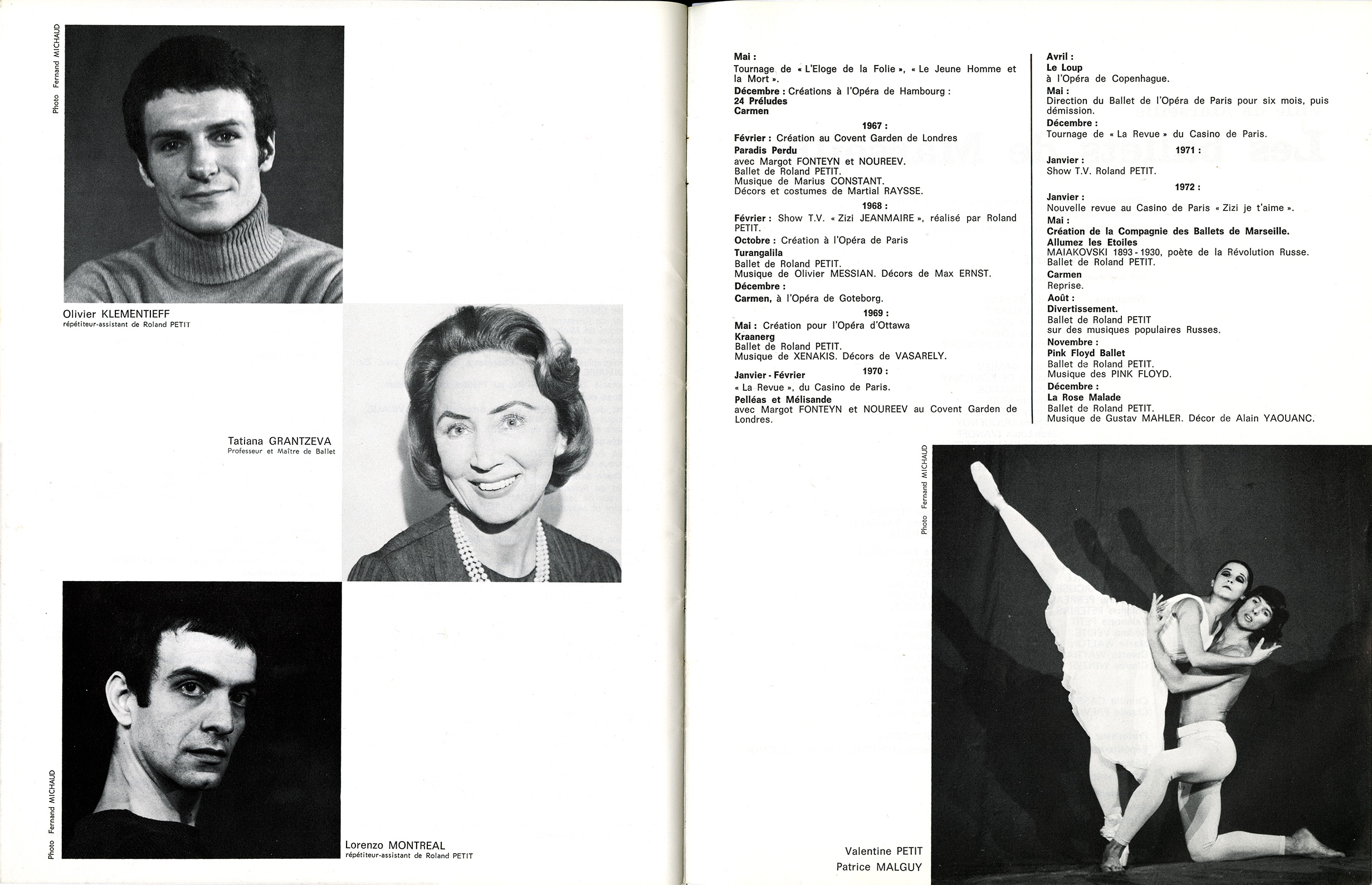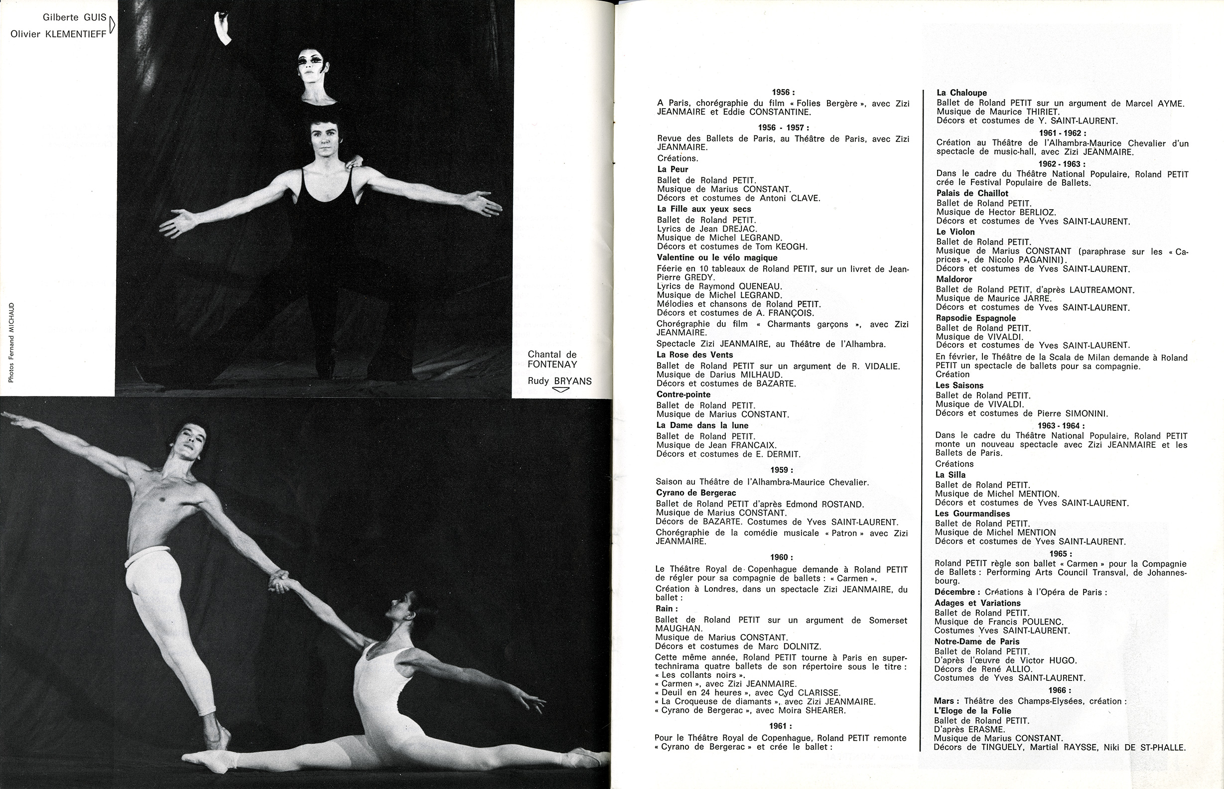 Folder Info: Includes extensive information in French about the Roland Petit ballet, dancers, and director Roland Petit. Features four pages about Pink Floyd, with a brief history of the band, a full page photo of the band members, an ad for Pink Floyd albums, and a page about the Pink Floyd ballet.