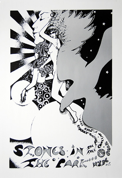 Notes: The art for this poster was copied from the 1967 Tomorrow poster for My White Bicycle by Hapshash and the Coloured Coat. The text on the poster was replaced by the words "Stones in the Park" and the venue and date.