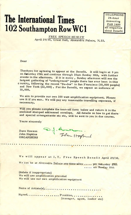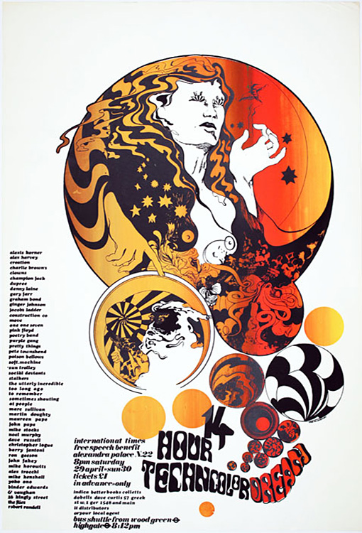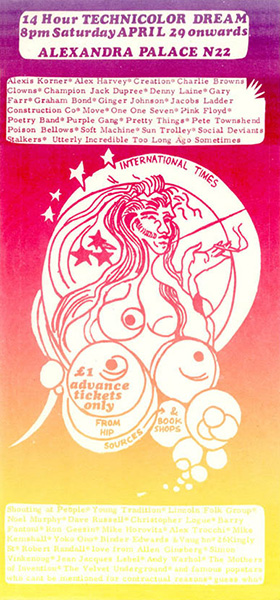 The 14 Hour Techncolor Dream was organized as a benefit for London's underground newspaper, the International Times. IT, as the newspaper was often called, was busted on March 9, 1967 for alleged obscenities and its offices raided in an attempt to close it down. In order to raise money for the paper’s defense fund, John “Hoppy” Hopkins, Barry Miles, and Jim Haynes organized the 14 Hour Techncolor Dream benefit concert. Coordinated by Jack Henry Moore, with posters by Michael McInnerney, the concert was announced by shooting rockets off over London and displaying posters in all the underground shops. The event attracted between 7,000 and 10,000 people, and featured poetry, theater, light shows, films, and two stages where bands played music simultaneously.