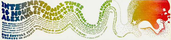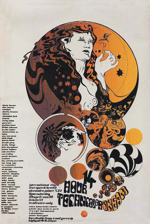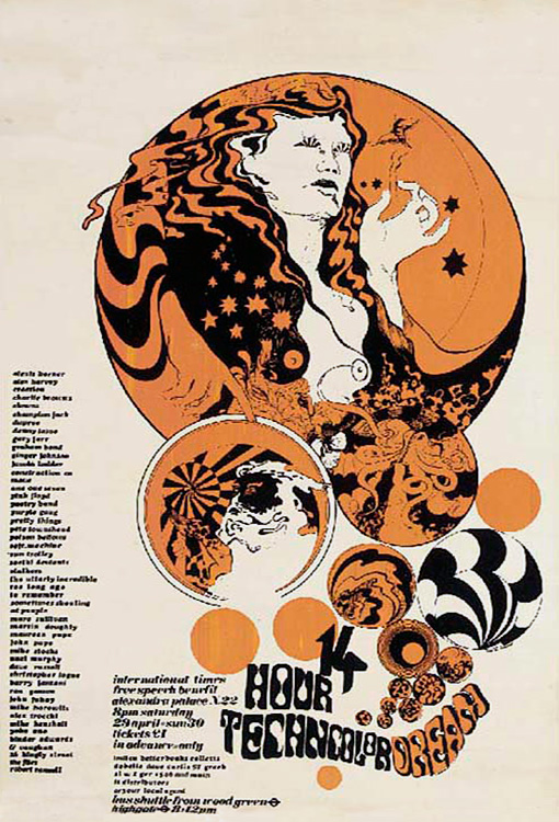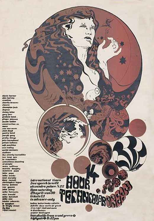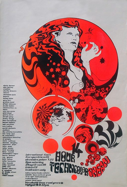 The poster for the 14 Hour Techncolor Dream is an iconic psychedelic image of the 1960s London Underground. The poster was designed and printed by Michael McInnerney, who was the art editor of the International Times newspaper at the time. When the paper was busted, McInnerney was asked to design the poster for the benefit show. McInnerney explained that "the psychedelic posters I produced were an attempt to illustrate states of mind associated with drug taking using the visual vocabulary of organic shapes found in art nouveau / jungendstil, as well as physical ideas of softness, meltingness, liquidness and poured forms." This style was exhibited in full in his poster for the 14 Hour Techncolor Dream.