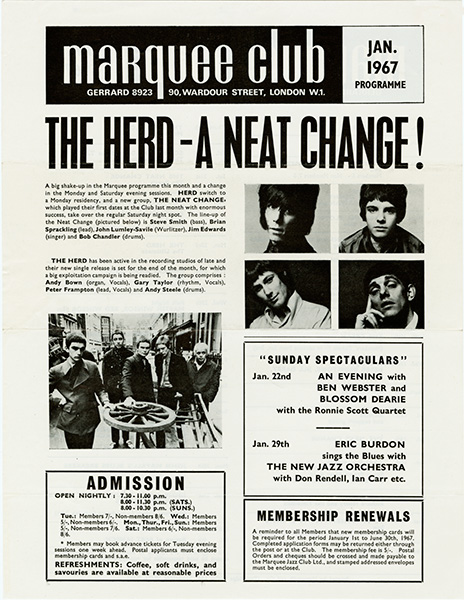 Notes: A two-sided handbill for the Marquee Club, with calendar on back, for January 1967. Pink Floyd is listed on the calendar for January 5, 1967 and January 19, 1967.