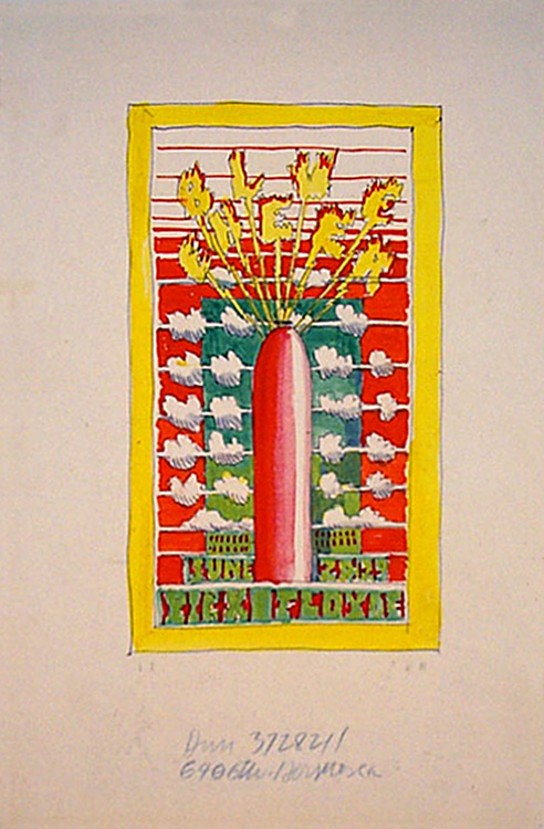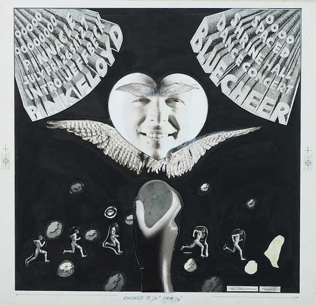 Notes: This is a color drawing by poster artist John Van Hamersveld for a proposed poster (that was never made) for a Blue Cheer and "Pink Floyde" concert at the Shrine Auditorium in Los Angeles, California on June 28 & 29, 1968. The drawing is on the back of a 12" x 8" handbill (on card stock) for a Chuck Berry/Chambers Bros./Peter Green's Fleetwood Mac show. It's signed and dated, with a few notes in the margins.