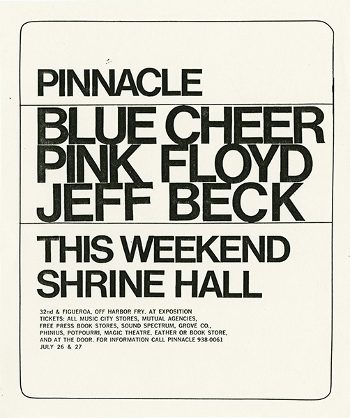 Notes: A card, with blank back, for the Pink Floyd, Jeff Beck, and Blue Cheer concerts at the Shrine Auditorium in Los Angeles on July 26-27, 1968.