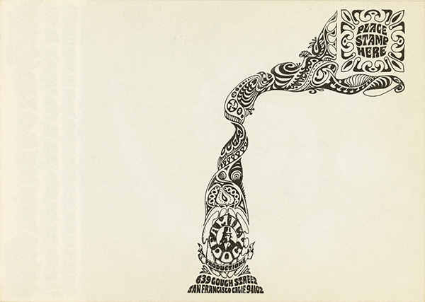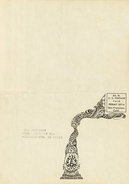 Notes: Issued as a double postcard with FD-132, with a bulk rate permit on the back of FD-132 (FD-131 & FD-132-OPC-C). Some copies were mechanically addressed to people on the Fillmore mailing list (FD-131 & FD-132-OPC-D).
