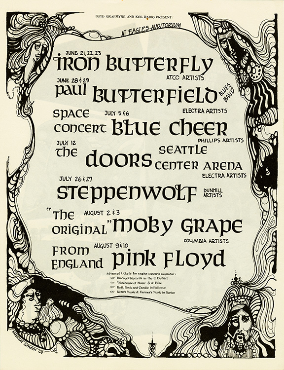 Notes: A small two-sided poster advertising seven different concerts at Eagles Auditorium in Seattle, Washington in June through August, 1968. On the back are album promos.