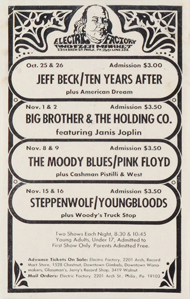Notes: A handbill for the Electric Factory in Philadelphia for October and November, 1968.