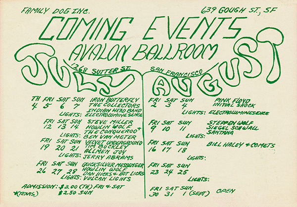Also on the back of this double handbill is a calendar listing July and August 1968 concerts at the Avalon including performances by Pink Floyd on August 2-4, 1968. Other concerts listed include Iron Butterfly, Steve Miller Band, Howlin' Wolf, Quicksilver Messenger Service, Steppenwolf, Santana, Bill Haley and the Comets, and more.
