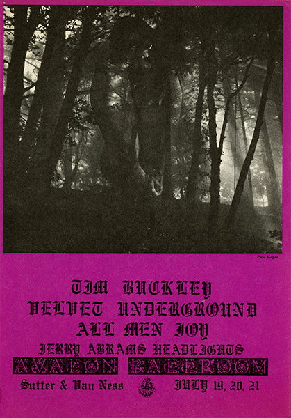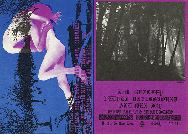 Notes: This is a two-sided handbill printed by Family Dog Inc. On the front is a color advertisement for The Velvet Underground, Tim Buckley, and All Men Joy at the Avalon Ballroom on July 19-21, 1968. Design by Paul Kagan.