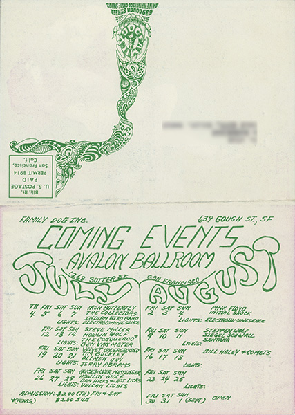 The back of this double handbill has a "Blk. Rt. U.S. POSTAGE PAID PERMIT 8914, San Francisco, Calif." in the upper right corner. It has been mechanically addressed to a member of the Avalon Ballroom mailing list.