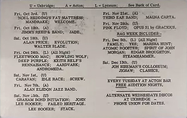 Date & Venue: Brunel University Arts Festival, Kingston Lane, Uxbridge, England, November 28, 1969