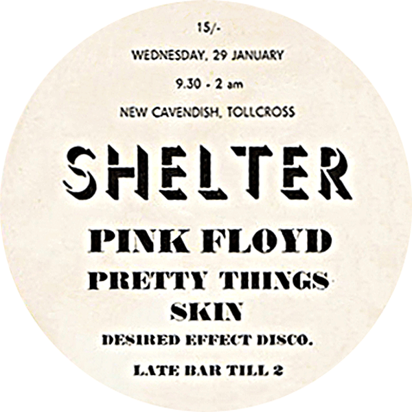 Notes: A round poster for the Shelter benefit held at the New Cavendish Ballroom in Edinburgh, Scotland on January 29, 1969.