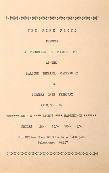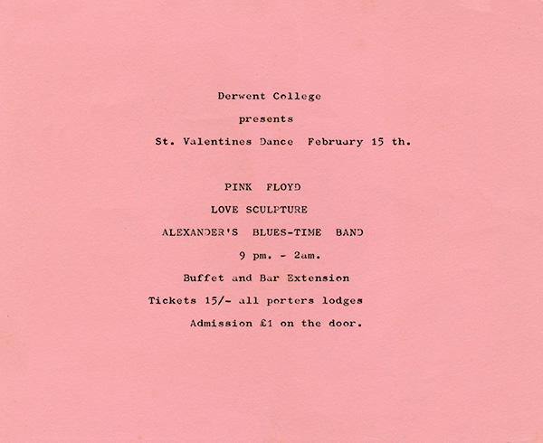 Notes: A handbill for the Pink Floyd show at Derwent College on February 15, 1969.
