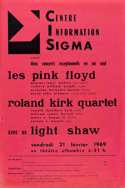 Notes: A small poster for the Pink Floyd show at Le Festival Sigma de Bordeaux at the Alhambra Theatre in Bordeaux, France on February 21, 1969.