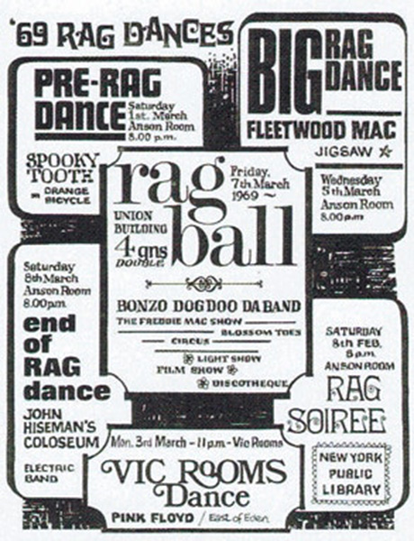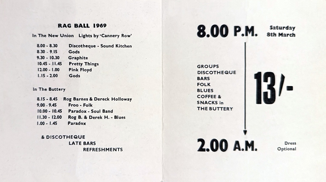 Notes: A handbill for the Pink Floyd show at the Rag Ball held in The New Union at Reading University, Reading, Berkshire, England on March 8, 1969.