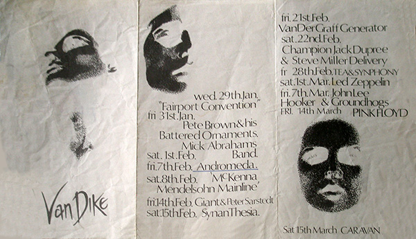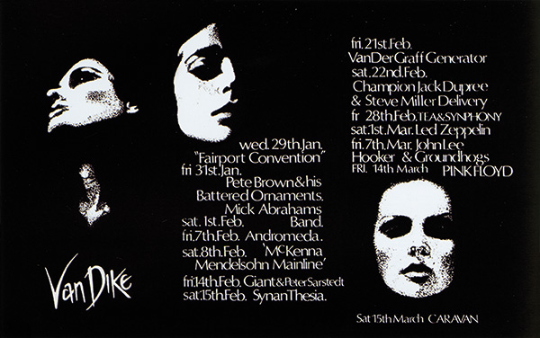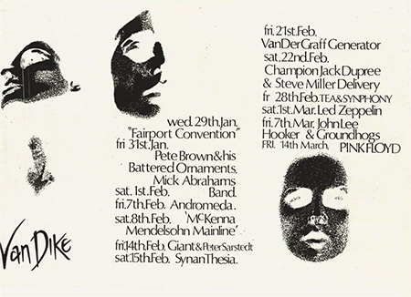 Notes: A black handbill from the Van Dike Club for January-March 1969. Pink Floyd is listed on the flyer on March 14, 1969.