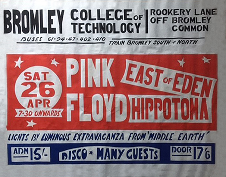 Notes: Original large poster for Pink Floyd, East of Eden and Hippotoma at the Technical College in Bromley on April 26, 1969.