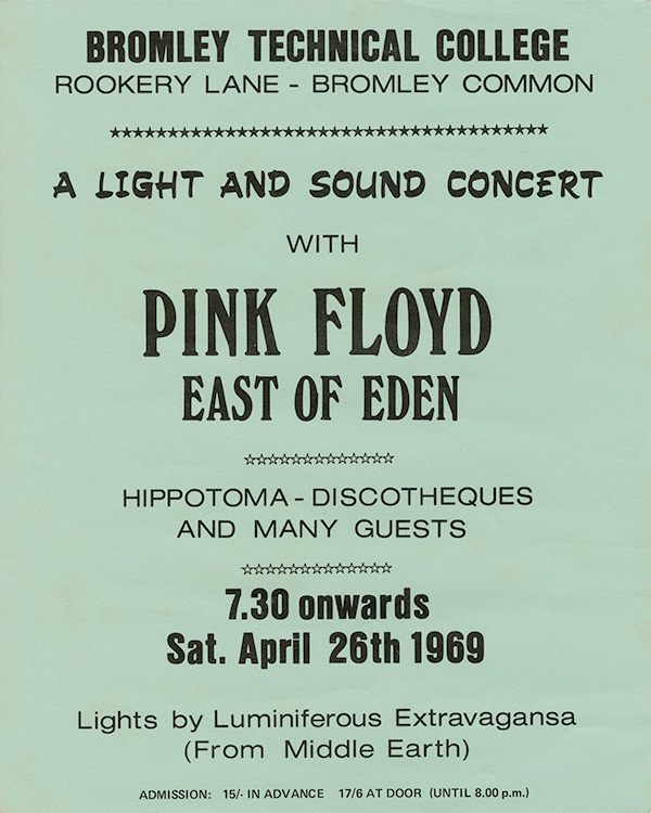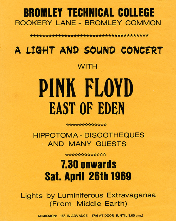 Notes: Original window poster / handbill for Pink Floyd and East of Eden at the Technical College in Bromley on April 26, 1969.