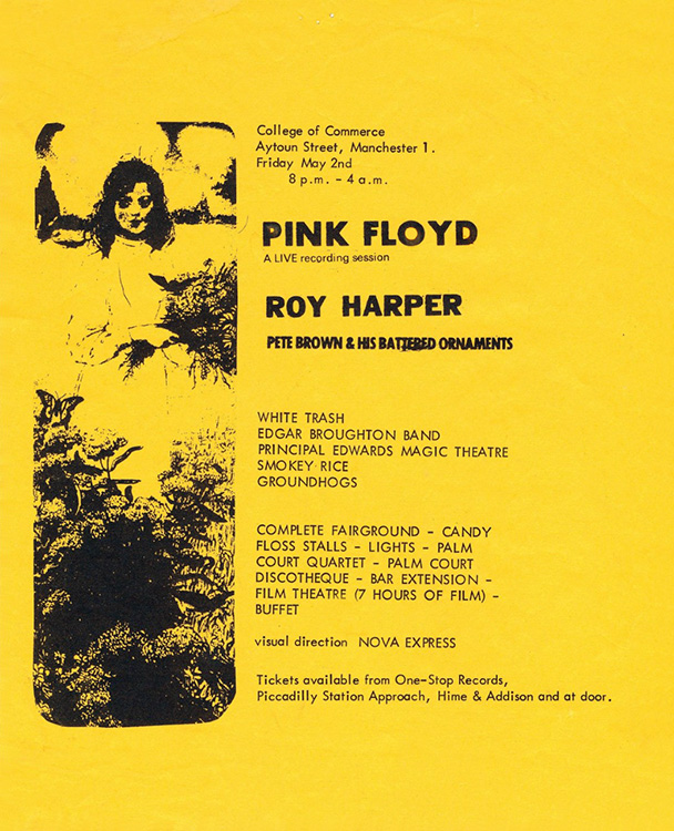 Bands: Pink Floyd, Roy Harper, Pete Brown & His Battered Ornaments, White Trash, Edgar Broughton Band, Principal Edwards Magic Theatre, Smokey Rice, Groundhogs