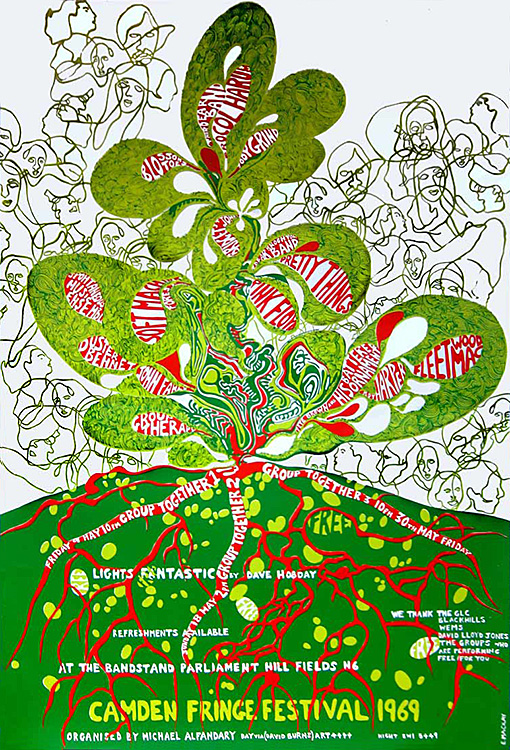 Notes: A poster for the three Camden Fringe Festivals at the Bandstand, Parliment Hill Fields in Hampstead, London, England on May 9, 18, 30, 1969.