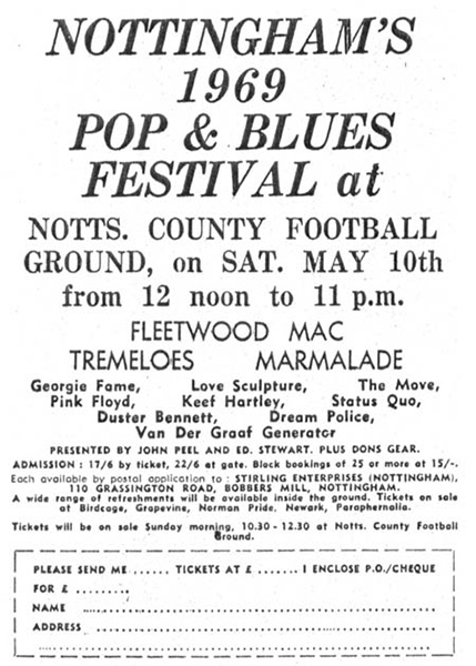 Notes: A poster for the Notts County 1969 Pop & Blues Festival on May 10, 1969. Pink Floyd was the final act at the festival, and played in the pouring rain.