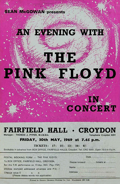 Notes: A handbill for the Pink Floyd concert at Fairfield Hall in Croydon, Surrey, England on May 30, 1969. Litho printed.