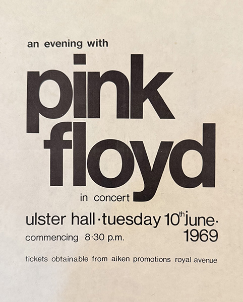 Notes: A handbill for the Pink Floyd show at the Ulster Hall in Belfast, Ireland on June 10, 1969.