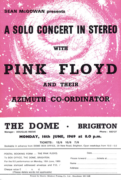 Notes: A handbill for the Pink Floyd show at The Dome in Brighton on June 16, 1969.