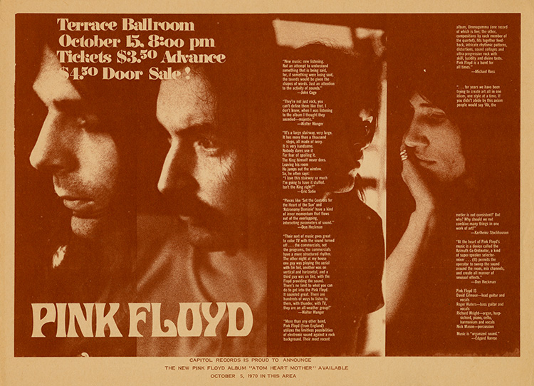 Notes: A small poster for Pink Floyd at the Terrace Ballroom in Salt Lake City, Utah on October 15, 1970.