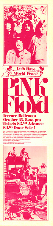 Notes: A tall narrow poster for Pink Floyd at the Terrace Ballroom in Salt Lake City, Utah on October 15, 1970.
