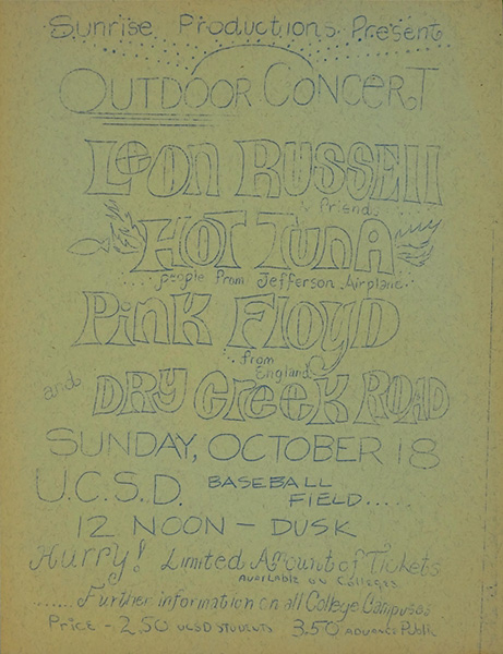 Notes: A flyer for Pink Floyd at the Intercollegiate Baseball Facility at University of California in San Diego, California on October 18, 1970. May have been printed with a Xerox machine.