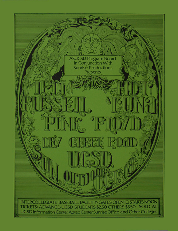 Notes: A poster for Pink Floyd at the Intercollegiate Baseball Facility at University of California in San Diego, California on October 18, 1970.
