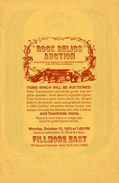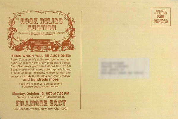 Notes: A handbill, with auction announcement on back, for upcoming shows at the Fillmore East in New York City. Pink Floyd is listed on September 27, 1970.