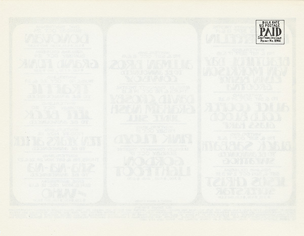 Notes: Postcard for upcoming concerts at the Berkeley Community Theater, Winterland, Oakland Coliseum, and the Civic Auditorium. Pink Floyd is listed as playing at Winterland on Friday, October 15, 1971.