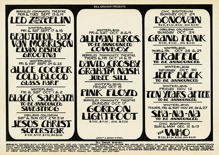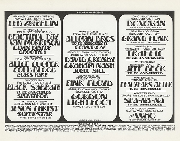 Notes: Handbill for upcoming concerts at the Berkeley Community Theater, Winterland, Oakland Coliseum, and the Civic Auditorium. Pink Floyd is listed as playing at Winterland on Friday, October 15, 1971.