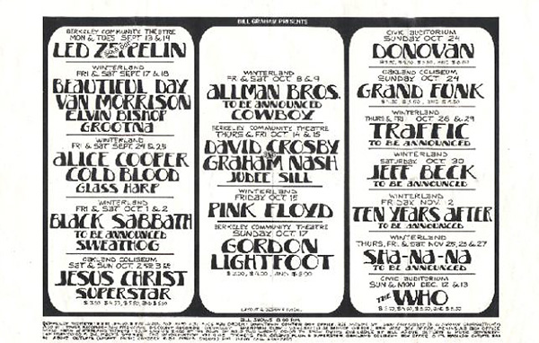 Bands: Led Zeppelin, Beautiful Day, Van Morrison, Elvin Bishop Group, Alice Cooper, Cold Blood, Glass Harp, Black Sabbath, Sweathog, Allman Brothers, Crosby & Nash, Judee Sill, Pink Floyd, Gordon Lightfoot, Donovan, Grand Funk Railroad, Traffic, Jeff Beck, Ten Years After, Sha-Na-Na, The Who