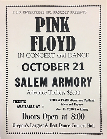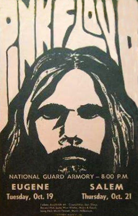 Notes: A small poster for the Pink Floyd concerts at the National Guard Armory in Eugene, Oregon on October 19, 1971, and at the Salem Armory Auditorium in Salem, Oregon, October 21, 1971.