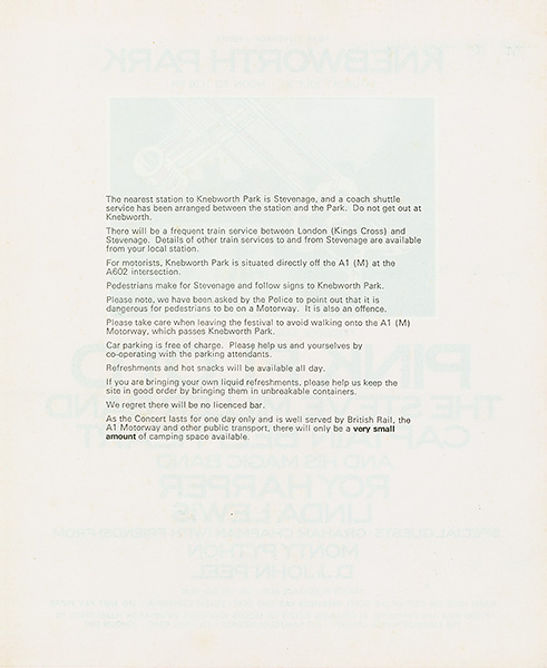 Notes: A two-sided flyer for the Knebworth Festival, with festival rules printed on the back.