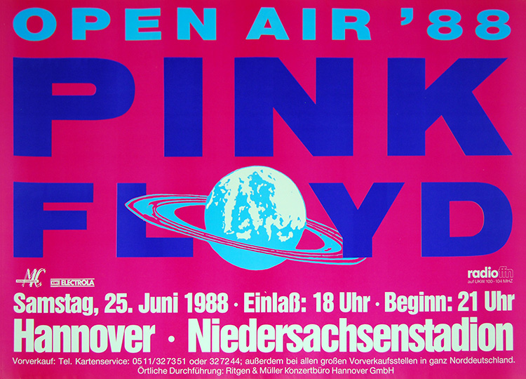 Notes: A blue poster for the Pink Floyd concert at the Niedersachsenstadion in Hannover, West Germany on June 25, 1988.