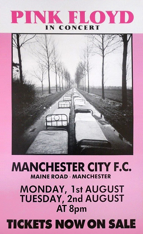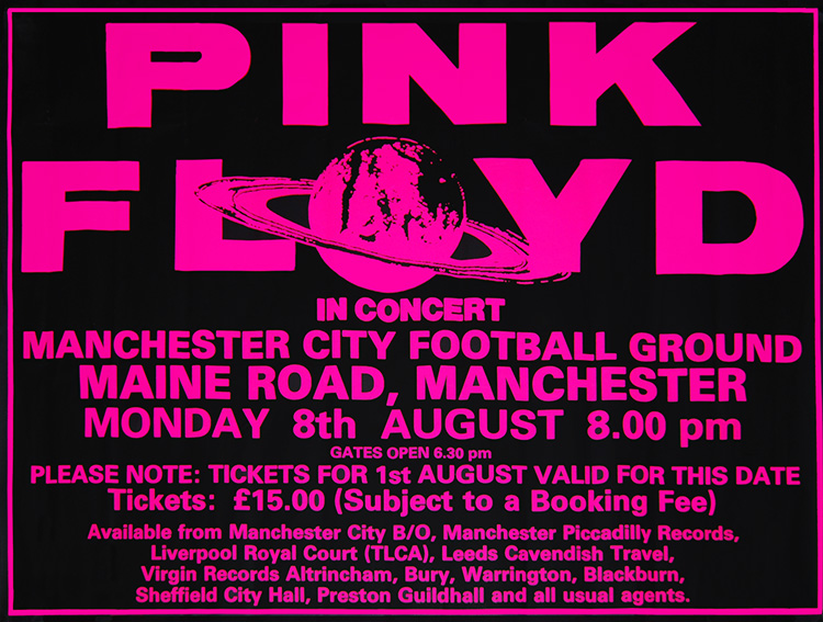 Notes: A small poster advertising tickets for Pink Floyd concerts at Manchester City Football Ground, Maine Road, Moss Side, Manchester, England.