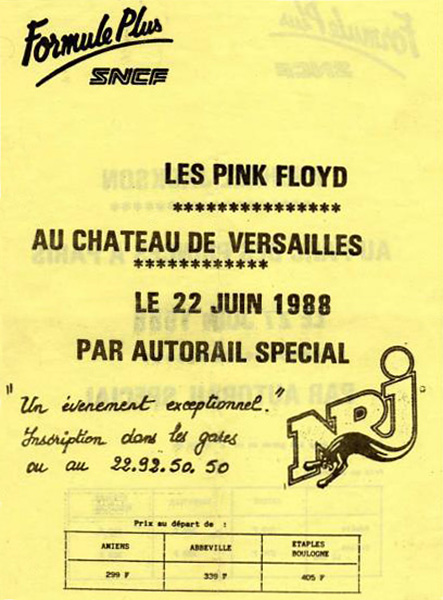 Notes: A two sided handbill by SNCF advertising trips to Versailles to see Pink Floyd at the Place d'Armes du Chateau de Versailles in Versailles, France on June 22, 1988. The back side is an ad for Michael Jackson.
