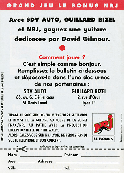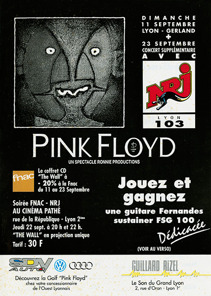 Notes: A handbill for the Pink Floyd concerts at Stade de Gerland in Lyon, France on September 11 & 23, 1994.