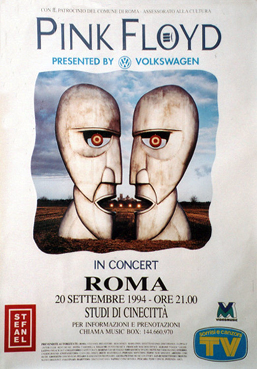 Notes: A poster for the Pink Floyd concert at Cinecitta in Rome, Italy on September 20, 1994. Additional concerts in Rome were added on the 19th and 21st after the poster was printed.