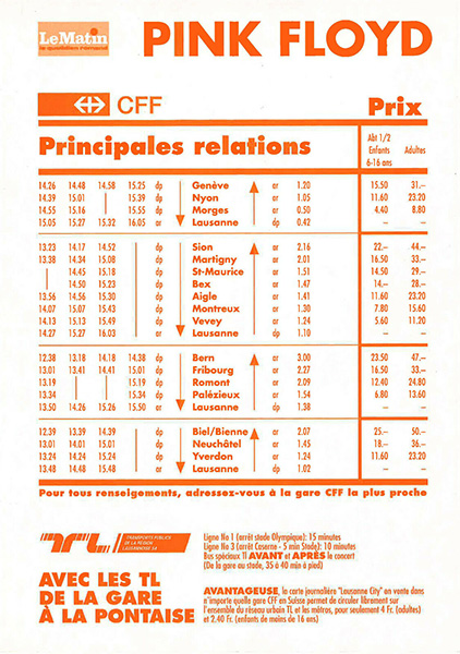 Notes: A two-sided handbill for the Pink Floyd concert at the Stade de la Pontaise in Lausanne, Switzerland on September 25, 1994.
